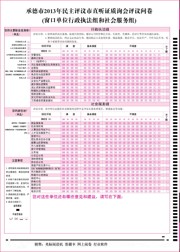 品科閱卷機的使用范圍:主要應(yīng)用于國內(nèi)外考試評卷、考試報名、志愿統(tǒng)計、各行各業(yè)的干部測評、考核、選舉、數(shù)據(jù)采集。現(xiàn)在品科的光標(biāo)閱讀機產(chǎn)品已經(jīng)在全國30幾個省市的重點初中、重點高中、重點大學(xué)使用開了。給廣大用戶提供了方便快捷,售后服務(wù)周到的印象。