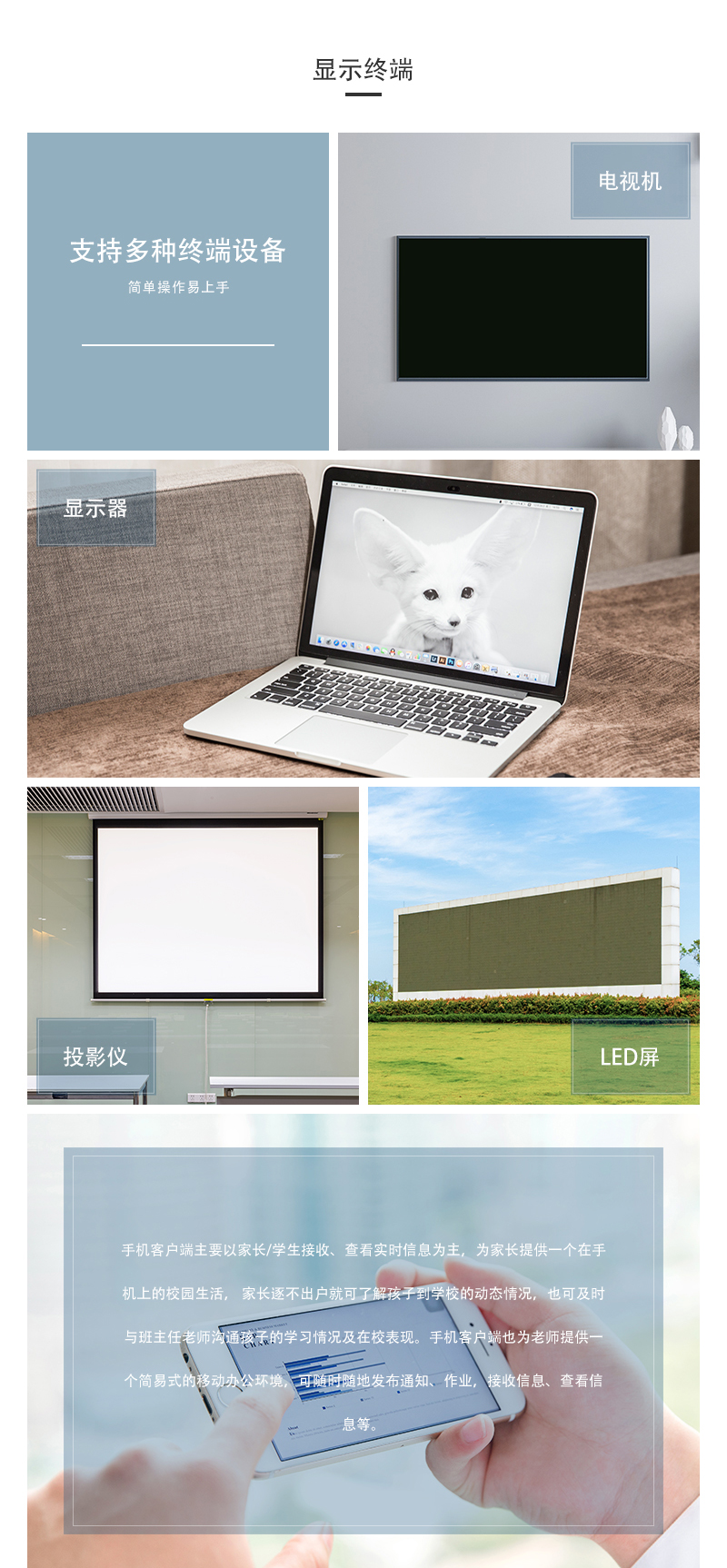 支持電視機、顯示器、投影儀、LED屏、手機端等多種顯示終端,簡單操作易上手。手機客戶端主要以家長/學生接收、查看實時信息為主,家長逐不出戶就可了解孩子到學校的動態情況,也可及時與班主任老師溝通孩子的學習情況及在校表現。手機客戶端也為老師提供一個簡易式的移動辦公環境,可隨時隨地發布通知、作業,接收信息、查看信息等。
